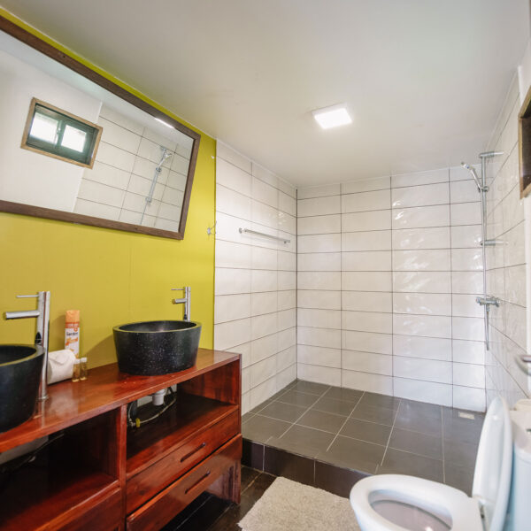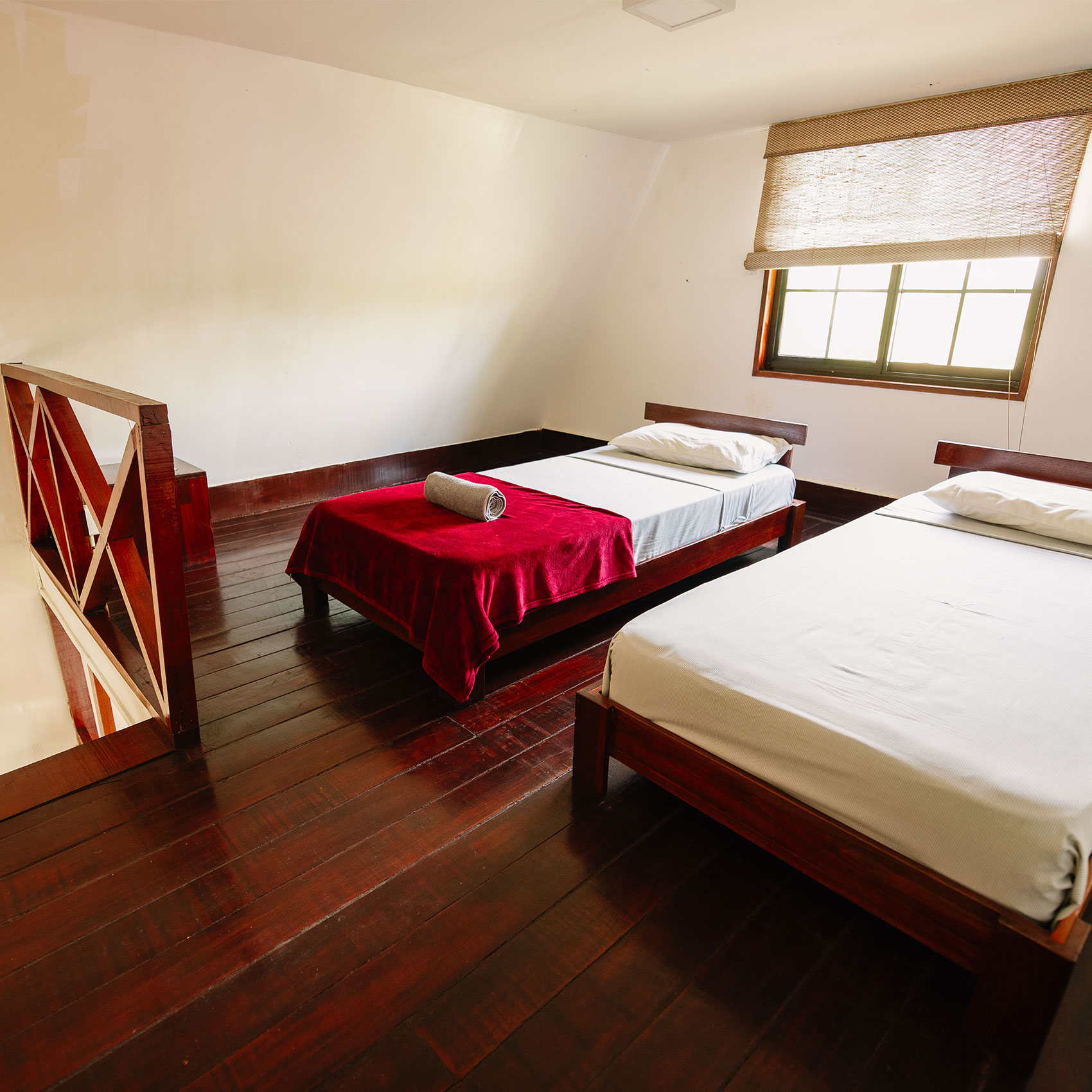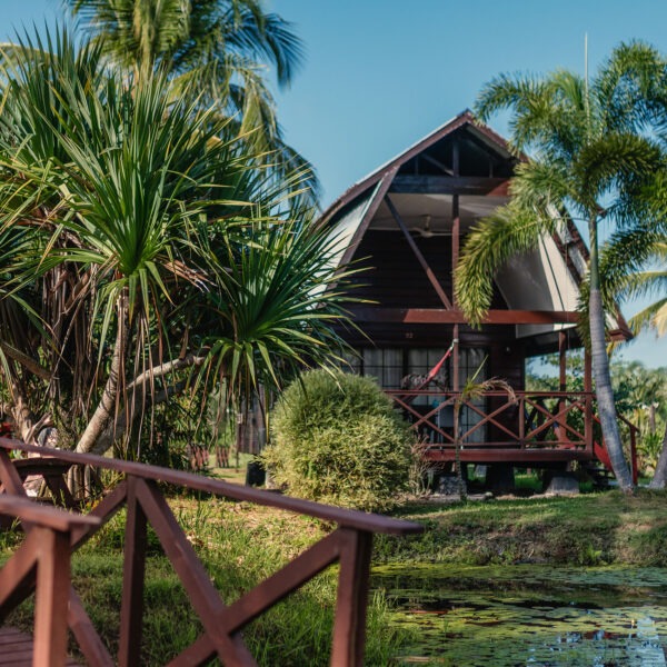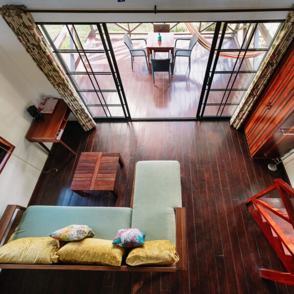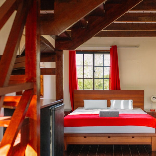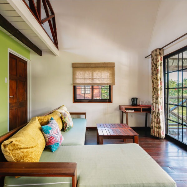 Our large garden cabanas are located in the lush gardens of the grande estate, within walking distance of the pool deck, restaurant and bar. This cabana can accommodate 4 persons and includes a king-sized bed, as well as two single beds. With its large glass doors and spacious open balcony, this lodge gives the ultimate holiday feeling.